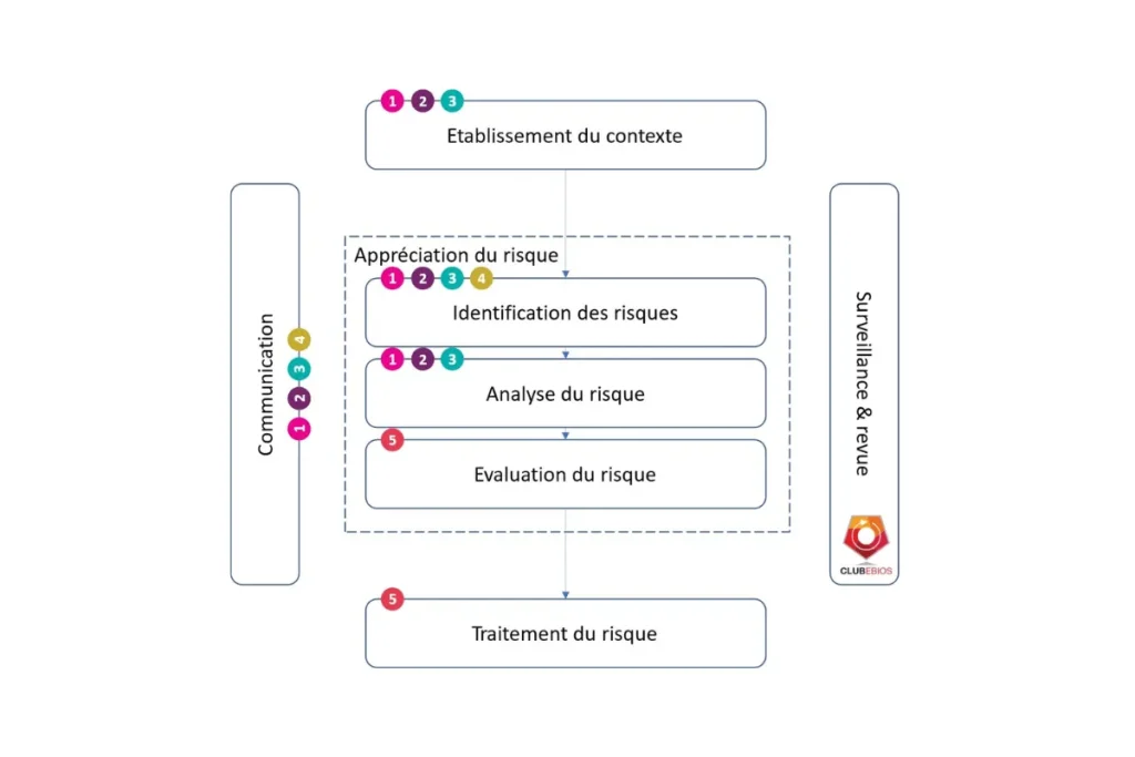 Depuis les dernières mise à jour du Framework EBIOS RM, celui-ci est totalement compatible avec la norme ISO27005:2022 – Préconisations pour la gestion des risques liés à la sécurité de l’information. Le club EBIOS propose l’infographie suivante montrant la correspondance entre les 5 ateliers de la méthode EBIOS RM et l’ISO27005