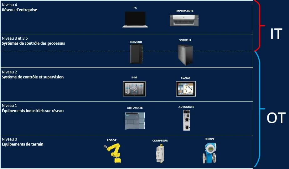 Le modèle Purdue est un référentiel largement utilisé pour structurer les réseaux industriels. Il divise l’architecture ICS en six zones distinctes (Cellule, Contrôle du processus, Supervision, Niveau de site et réseau de périmètre industriel, Réseaux de l’entreprise) contenant des systèmes IT et OT, illustrant comment les éléments typiques d’une installation industrielle s’interconnectent. Déployé correctement, il permet un cloisonnement intégral entre ICS/OT et IT, offrant la possibilité d’appliquer des contrôles d’accès stricts sans entraver les opérations.
